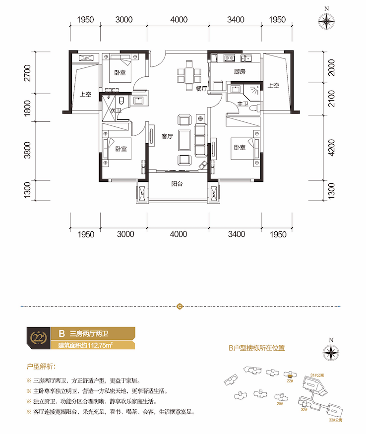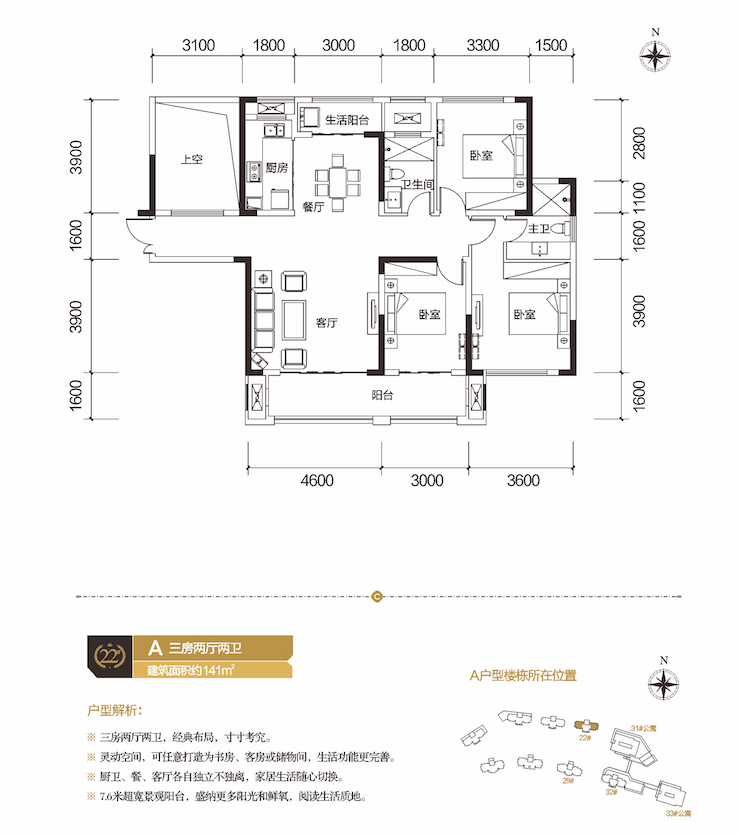 1)三房两厅两卫,经典布局,寸寸考究; 2)灵动空间,可任意打造为书房、客房或储物间,生活功能更完善; 3)厨卫、餐、客厅各自独立不独离,家居生活随心切换; 4)7.6米超宽景观阳台,盛纳更多阳光和鲜氧,阅读生活质地。