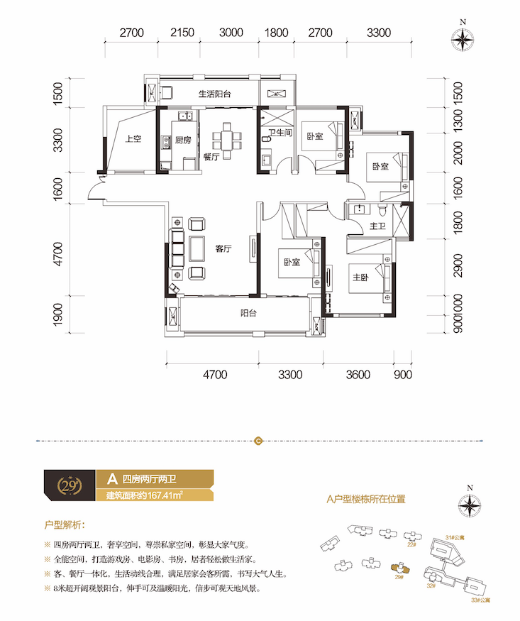 1)四房两厅两卫,奢享空间,尊崇私家空间,彰显大家气度; 2)全能空间,打造游戏房、电影房、书房,居者轻松做生活家; 3)客、餐厅一体化,生活动线合理,满足居家会客所需,书写大气人生; 4)8米超开阔观景阳台,伸手可及温暖阳光,信步可观天地风景。