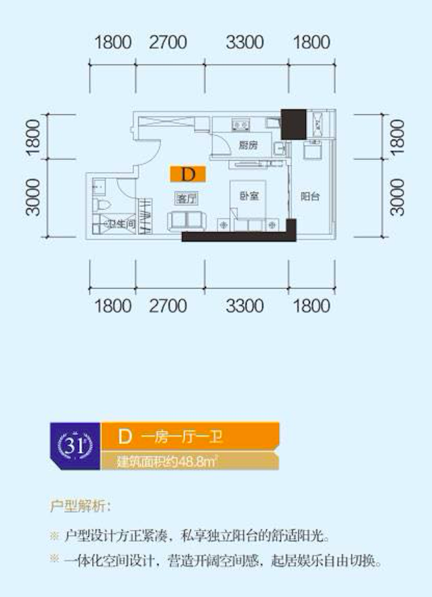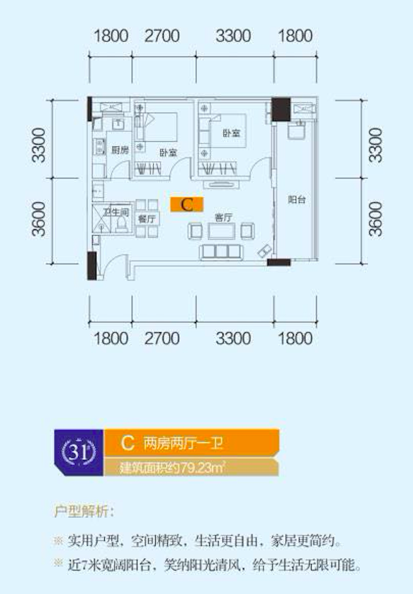 1)实用户型,空间精致,生活更自由,家居更简约; 2)近7米宽阔阳台,笑纳阳光清风,给予生活无限可能。